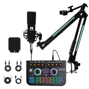Accessories like boom arm stands, pop filters, shock mounts, and audio mixers help improve sound quality and recording comfort.